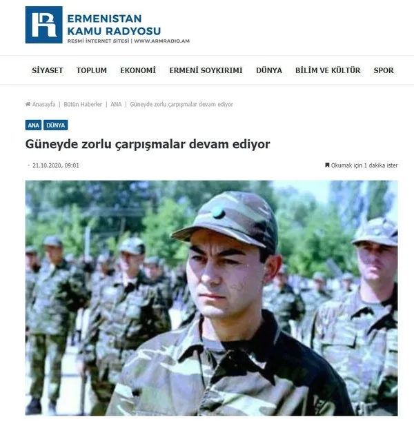 Ermenistan Kamu Radyosu’nun internet sitesinde bir skandala imza atıldı. Azerbaycan ordusu karşısında çaresiz kalan Ermeniler, algı oluşturmak için resmi kurumları ve yetkilileri aracılığıyla alay konusu olan paylaşımlar yapıyor. Ünlü şarkıcı Serdar Ortaç'ın askerlik fotoğrafı ile yayımladıkları haber ile alay konusu oldular.