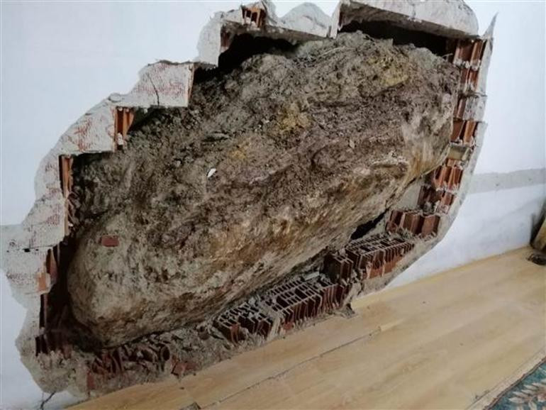 İZMİR’in Tire ilçesi dağdan kopan dev kaya parçası bir evine içine girdi, bu sırada evde yemek yiyen aile üyeleri ölümden döndü.